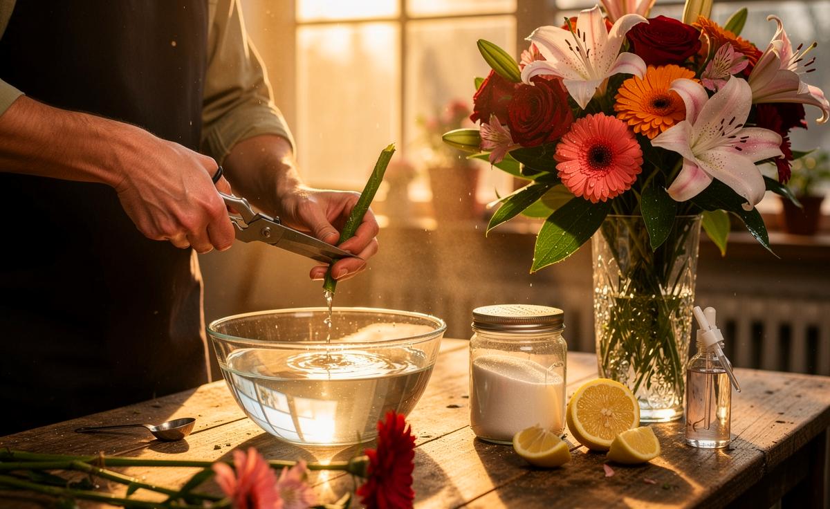 Ein Florist verrät den 3-2-1-Trick: Mit Zucker, Säure und Hygiene halten Schnittblumen bis zu zwei Wochen. Plus Profi-Tipps zu Anschnitt, Wasser und Lagerung.